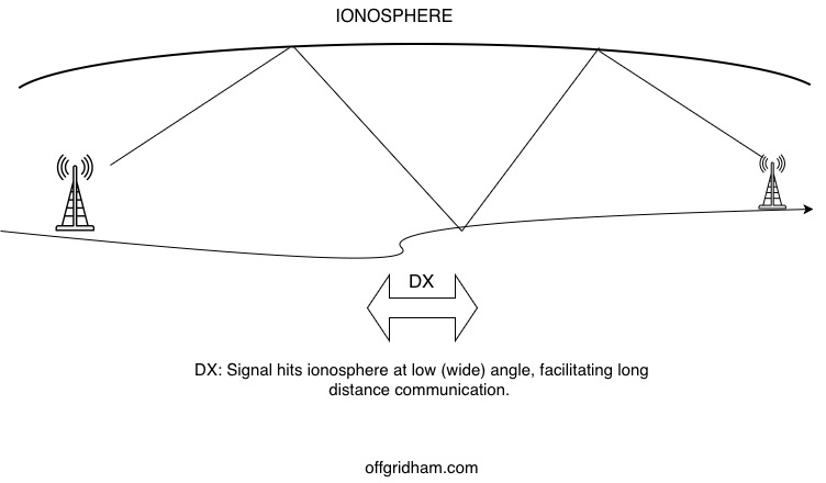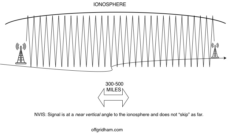 NVIS is simply sending a signal deliberately intended not to “skip” great distances. To send an effective DX signal, one must transmit at low wide angle to the ionosphere. In NVIS, the signal is sent at a very sharp, acute angle, almost ninety degrees. That’s where the “near vertical” part comes from.